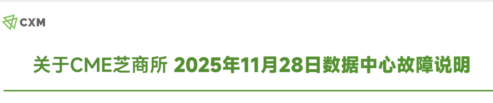 2025年11月28日星期五,全球最大的衍生品交易所芝加哥商品交易所集团(CME Group)旗下Globex交易平台因芝加哥地区CyrusOne数据中心冷却系统故障而长时间中断交易。故障始于周四美国交易时段尾声,并持续至亚洲和欧洲交易时段,导致与股指、国债、大宗商品和主要外汇货币对挂钩的关键期货和期权合约交易暂停。与这些合约相关的价格信息实际上被冻结,使得全球市场失去了一个用于风险转移和对冲的中心基准。